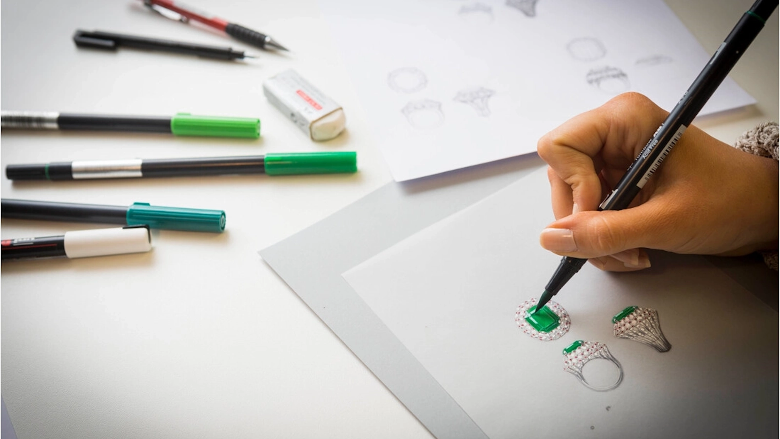 Le premier croquis permet de donner une idée complète du futur bijou. Il est ensuite peaufiné en collaboration avec les équipes techniques et le Service Pierres. Le dessinateur doit notamment s'assurer de la faisabilité de sa pièce. Il/elle est également présent tout au long de la fabrication, depuis la maquette jusqu'à la pièce finie, car le dessinateur est le garant de son dessin et doit donc s'assurer que sa reproduction soit la plus fidèle possible.
